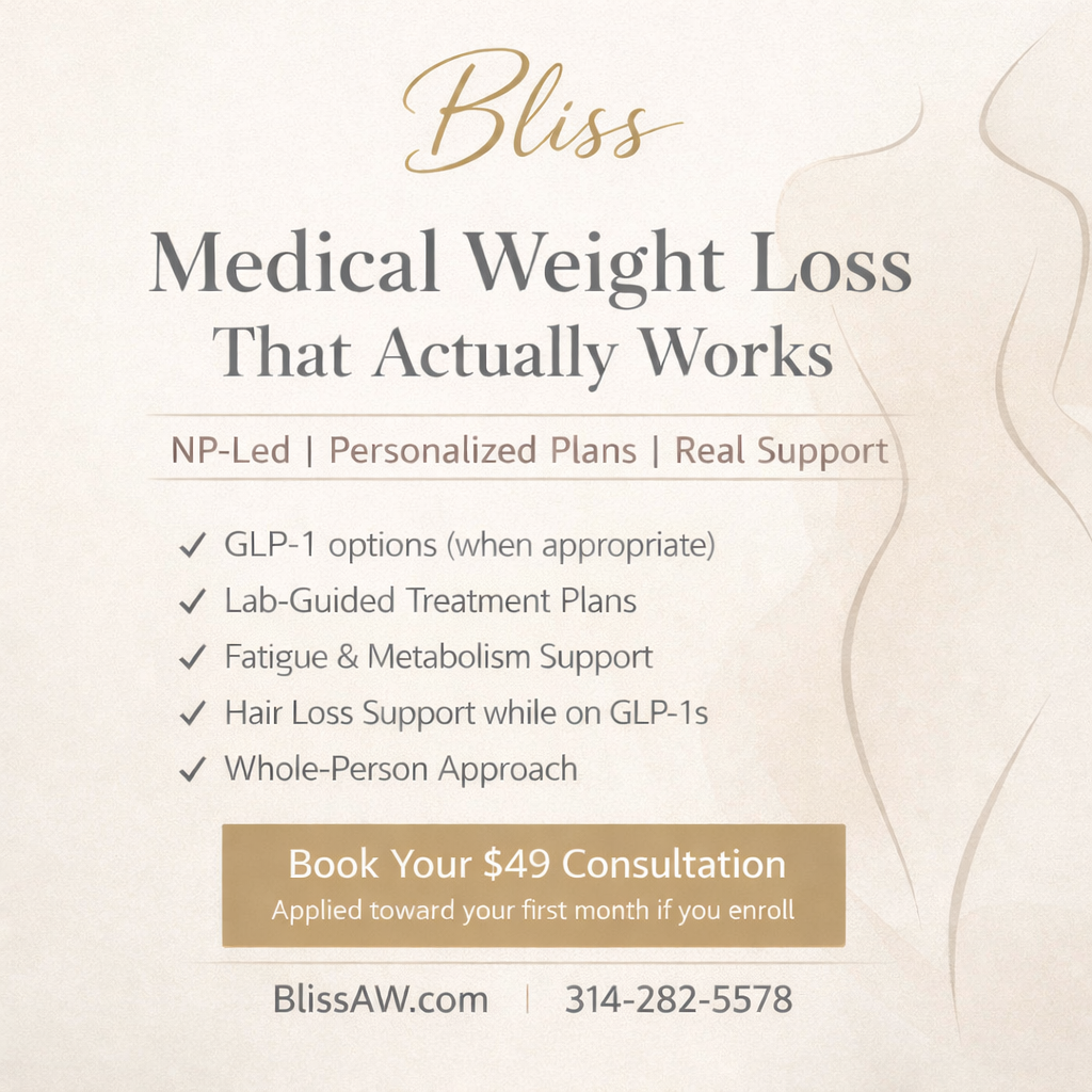 No waiting. Start your journey today via secure telehealth visit or an in-person visit (at Bliss location in Imperial, Missouri) with our Nurse Practitioner.