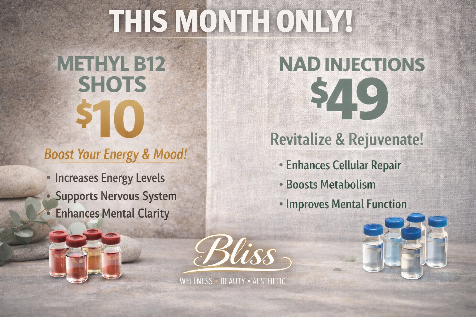After a quick wellness check, we’ll customize the perfect treatment plan to support your goals—We’ll match you with the right treatment to fuel your body and refresh your mind. From boosting energy and focus, to achieving a radiant glow, to supporting longevity and immunity, each therapy works from within to help you feel stronger, healthier, and more vibrant every day. Bliss makes it simple—Safe. Effective. Designed for YOU.